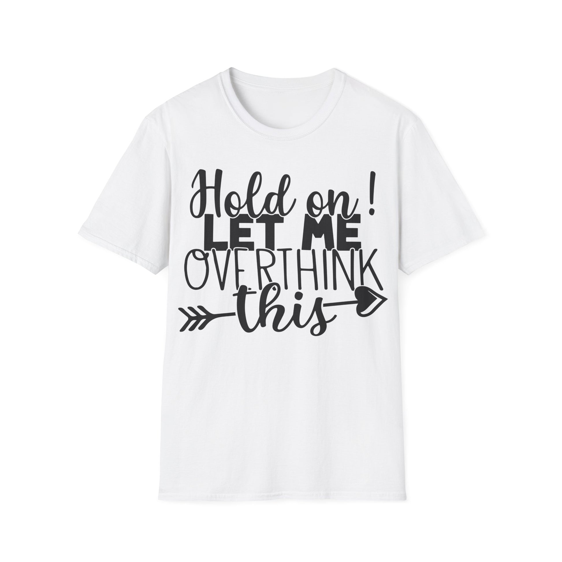 Lighthearted and honest, this soft cotton tee carries a wink for anyone who lives, loves, and laughs through a mind that never sleeps. The bold hand-lettered message — “Hold on! Let me overthink this” — sits center-front with a playful arrow accent, turning everyday anxiety into shared humor. Wear it on lazy mornings with coffee, on video calls when you need a conversational icebreaker, or tucked into jeans for a low-key weekend errand run. The fabric breathes and drapes easily; the crew neck and classic fit keep the silhouette familiar and comfortable. This shirt feels like the friend who gets you: candid, warm, and a little self-aware.